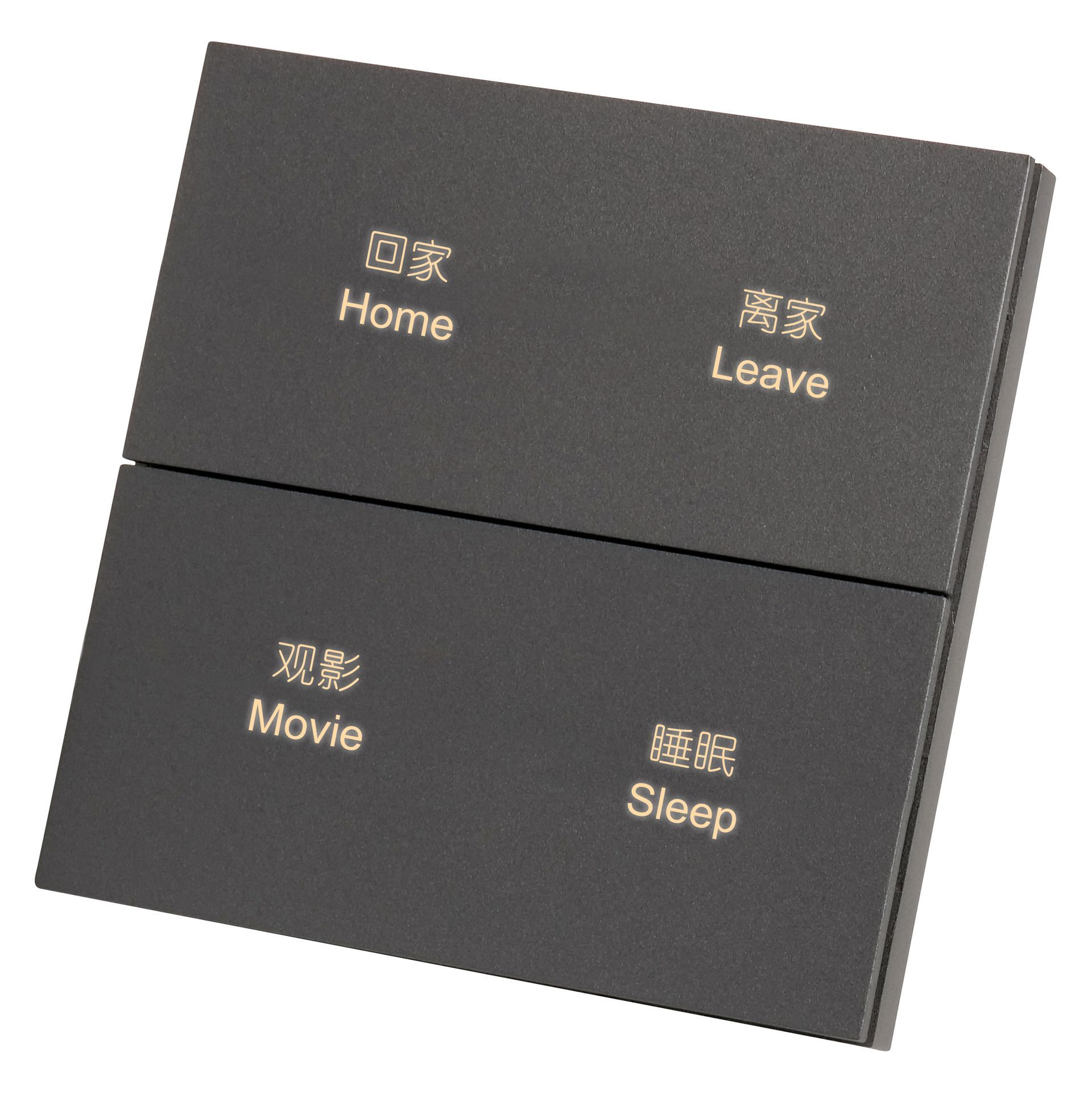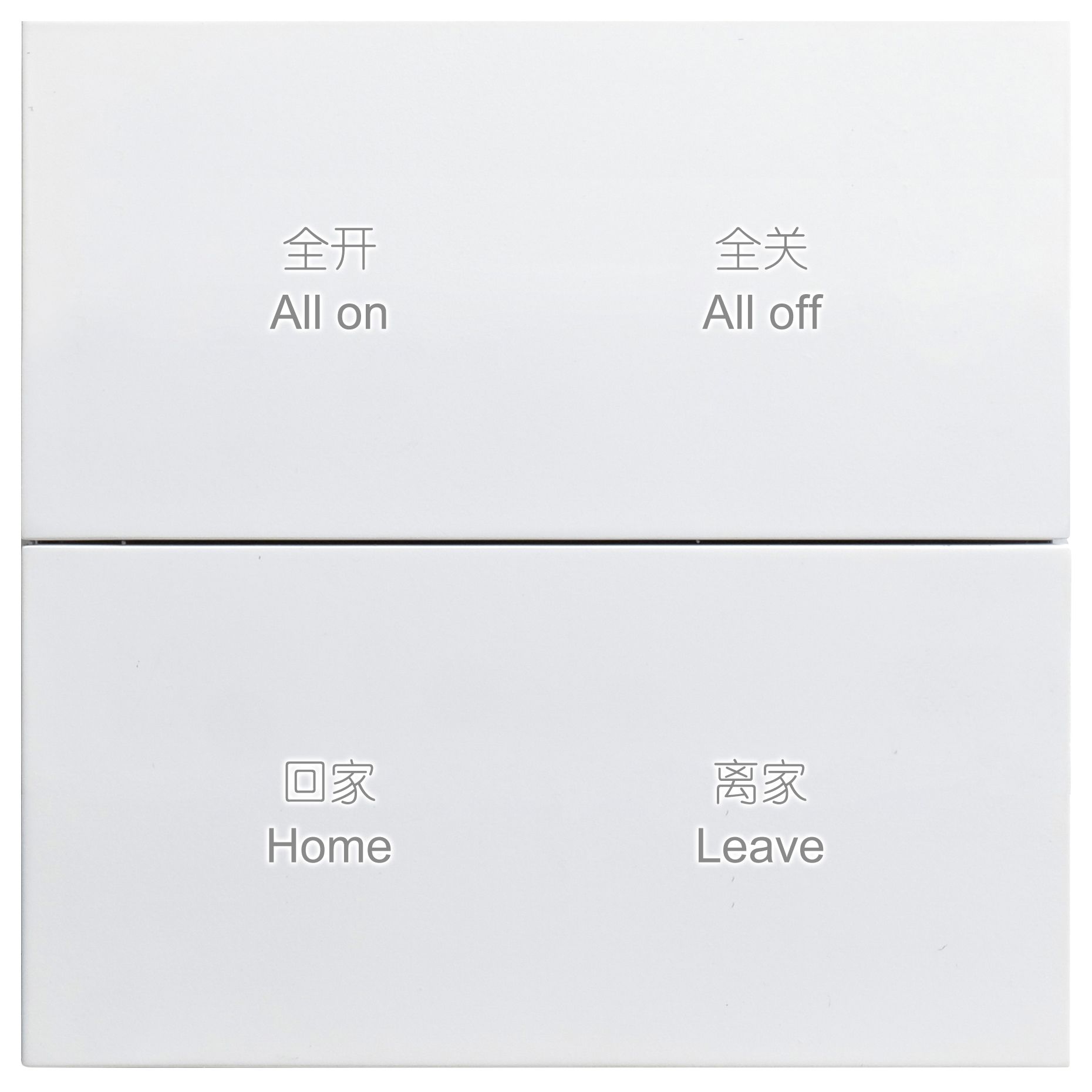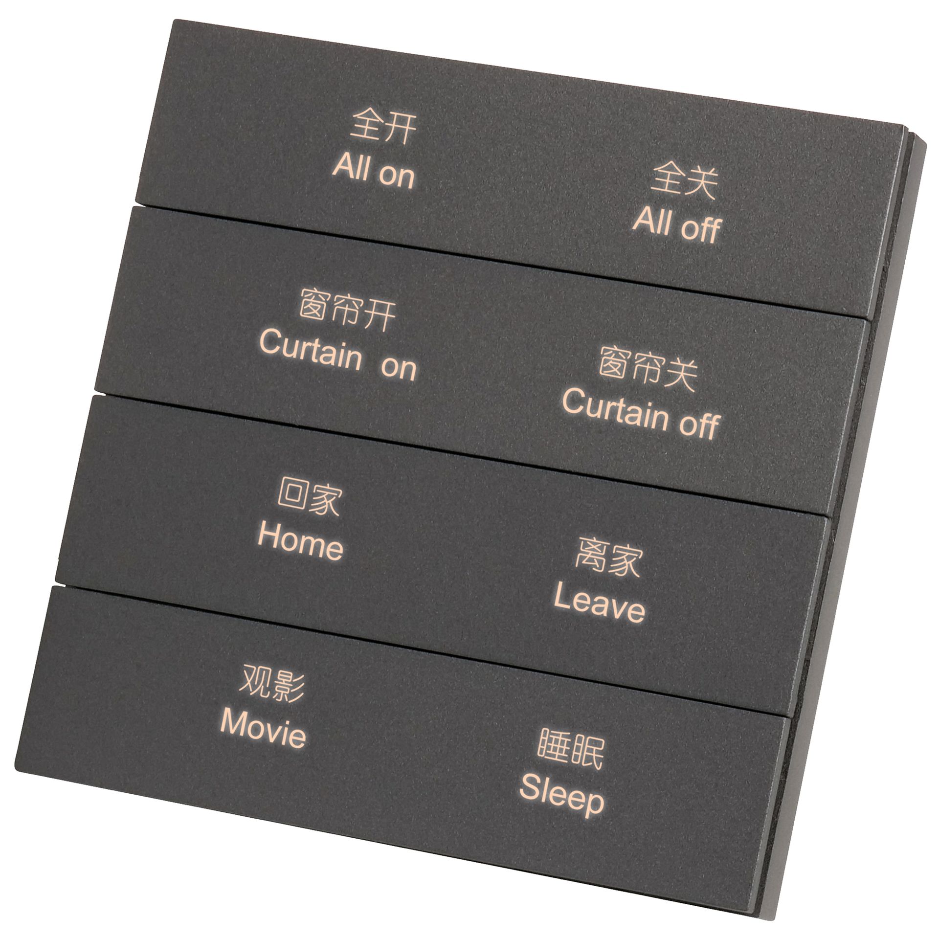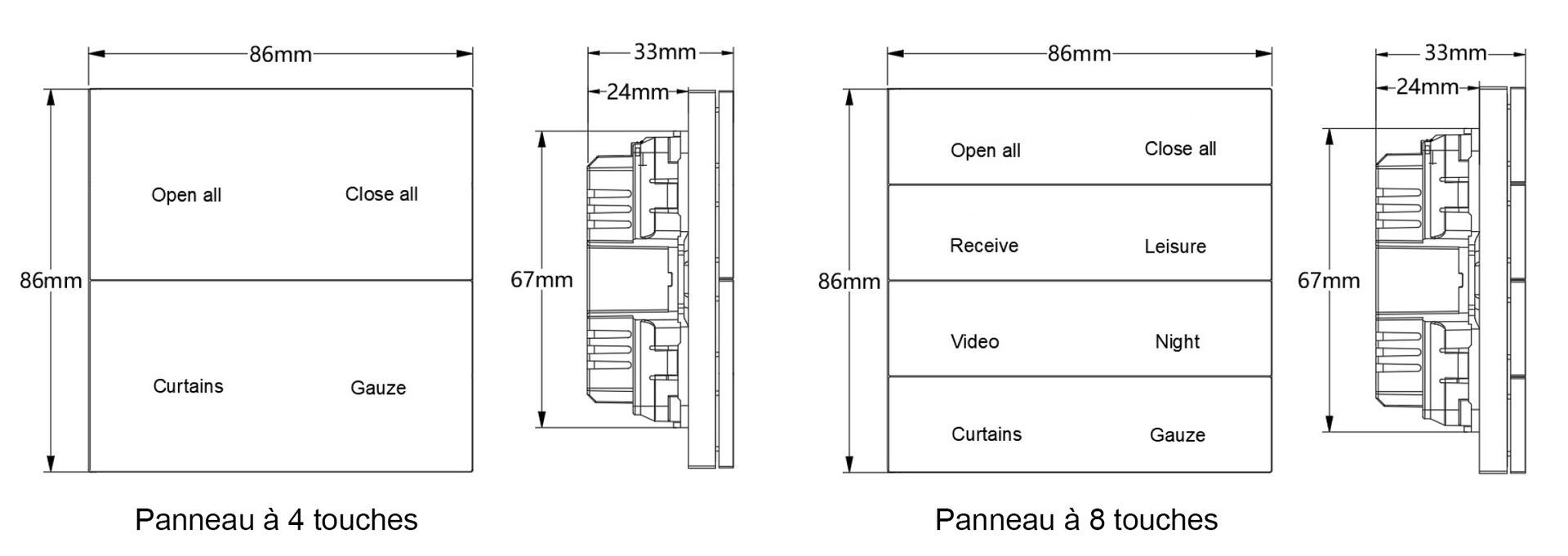 Il peut être utilisé pour contrôler les interrupteurs, la gradation, les scènes, les stores, etc. Chaque canal du panneau comprend un bouton et un indicateur LED. Il peut utiliser les différentes fonctions décrites ci-dessus, indépendamment les unes des autres.